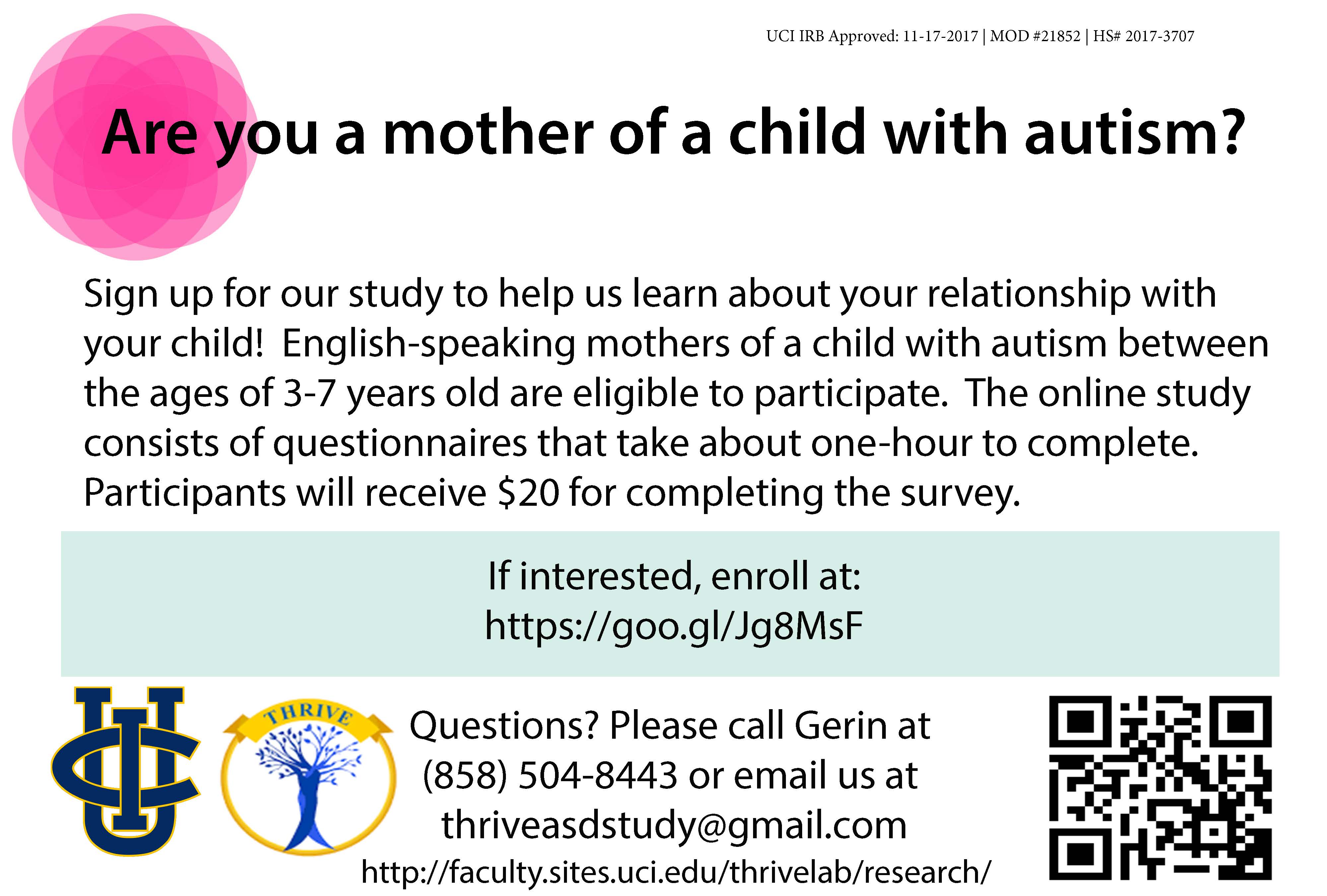 If you would like more information, contact Gerin at (858) 504-8443 or thriveasdstudy@gmail.com. See below of FAQ.