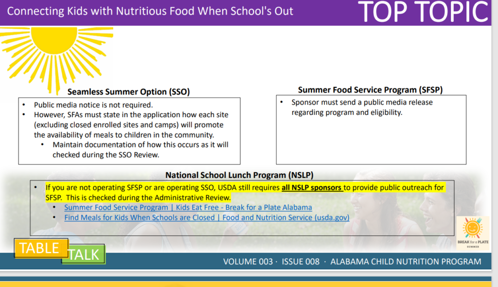 The USDA Food and Nutrition Service Division requires schools to conduct Summer Food Service Program (SFSP) outreach to help ensure eligible families are informed of the availability and location of SFSP meals. If you are seeking assistance, click on the following links to find an SFSP in your area.